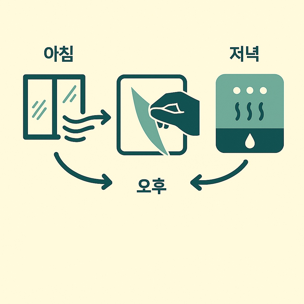 습도는 하루 단위 루틴이 쌓일수록 효과가 커집니다. 결로는 공간별로 원인과 해결 방법이 다르기 때문에, 아래 루틴을 참고해 실천하는 것이 중요합니다.
