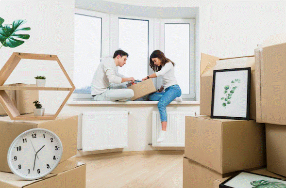 신축 아파트에 막 이사한 뒤, 함께 박스를 정리하는 커플의 모습. 수납 동선 설계의 중요성을 떠올리게 합니다.