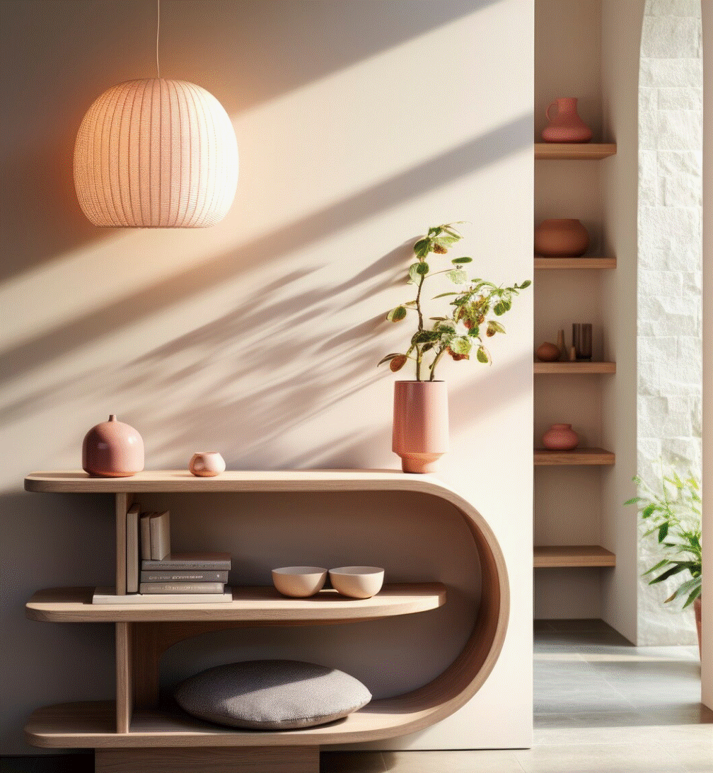 곡선형 수납장과 자연광이 어우러진 따뜻한 분위기의 거실 공간. 기능성과 미적 감각을 동시에 충족하는 수납 예시입니다. 공간 넓어 보이는 진짜 비결?