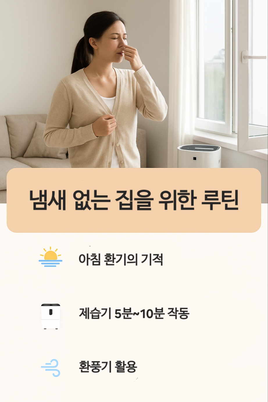 아침 환기+제습 루틴을 시각화한 실제 사용 장면 이미지입니다 ① 아침 공기 리셋 루틴 – 환기 5분 + 제습 5분