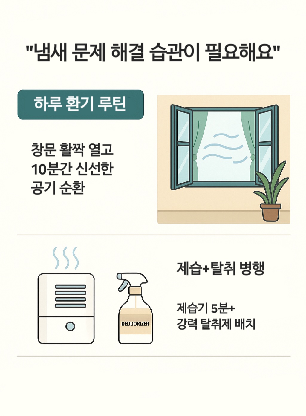 냄새 잡는 건 특별한 날의 대청소보다 매일의 짧은 루틴이 더 효과적이에요.