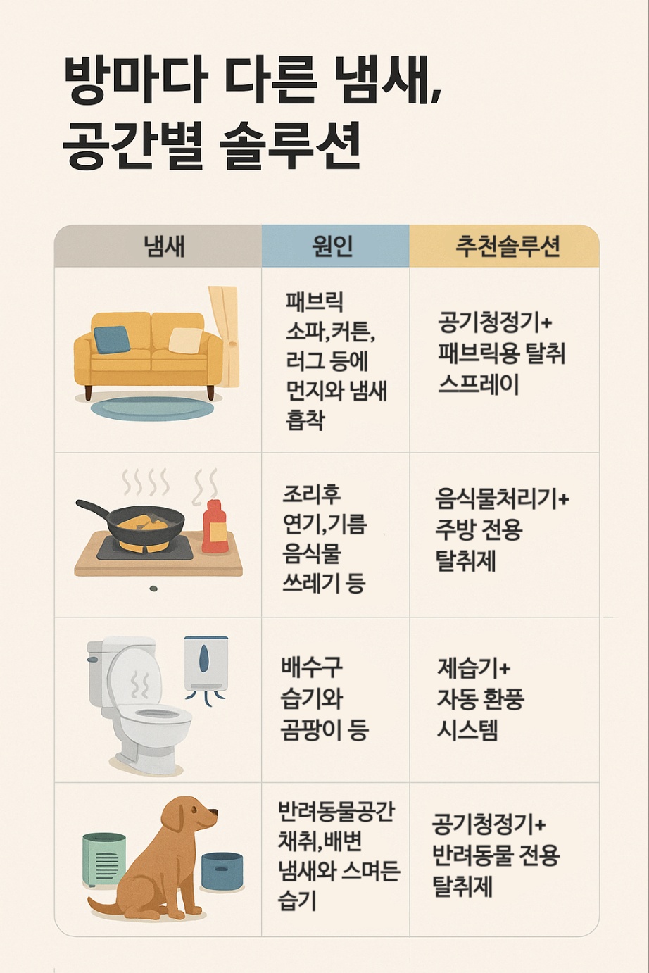 오늘은 공간별 냄새의 원인과 맞춤형 솔루션을 소개합니다.