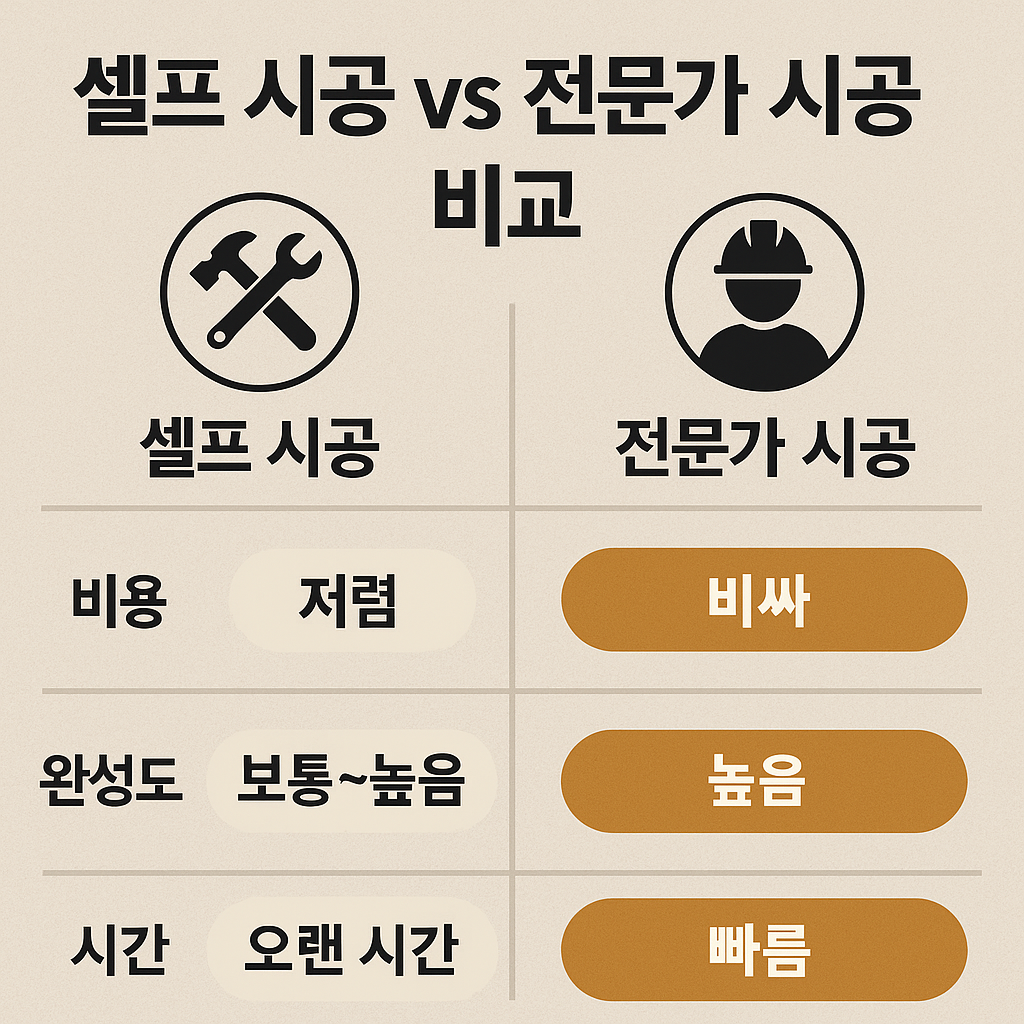 👉 이 비교표 한 장이면, 셀프냐 전문가냐 고민 끝!항목 셀프 시공 전문가 시공 비용 5~15만 원 (재료+도구) 30~60만 원 (규모/마감 따라 상이) 시간 3~6시간 소요 2~3시간 내 완료 완성도 연습이 필요 마감 깔끔, 책임 시공 변형 대응 직접 해결 필요 사후 AS 가능 🏠 공간 분리 인테리어가 궁금하다면?