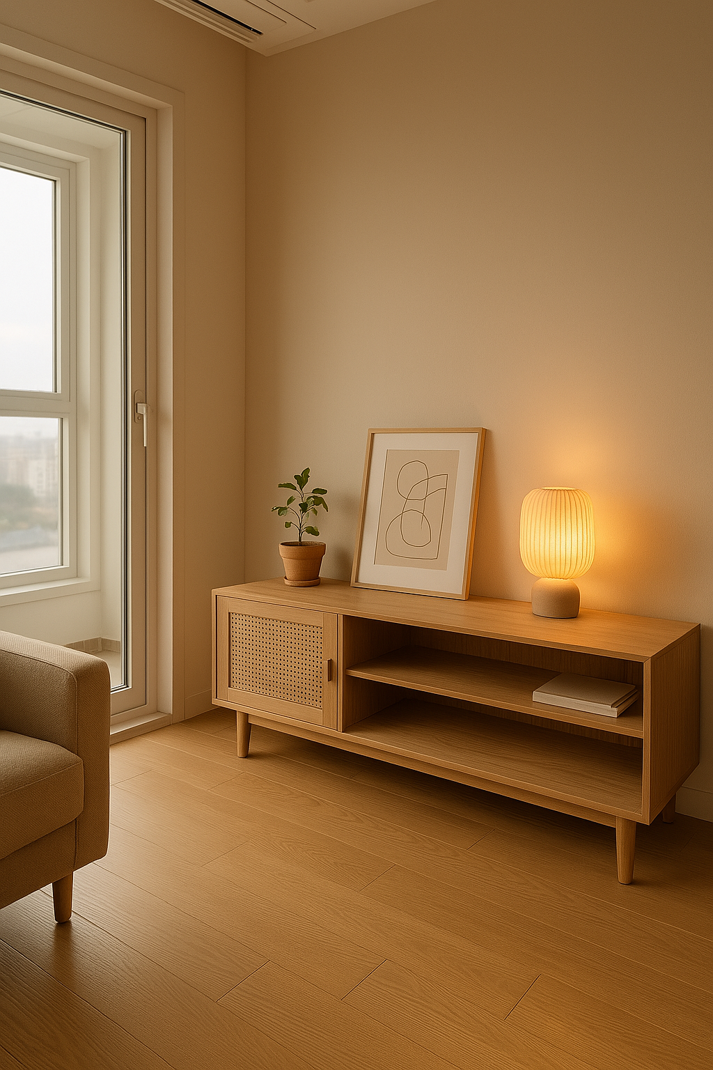 낮은 수납장과 톤을 맞춘 소파, 포인트 소품만으로도 거실 전체가 정돈된 감성으로! ✔ 거실: 로우보드 + 포인트 장식