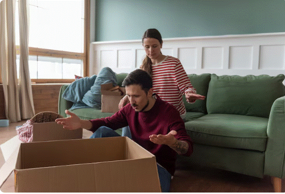 신축 아파트 이사 후, 정리되지 않은 거실과 수납에 고민하는 모습. 누구나 겪는 현실입니다.
