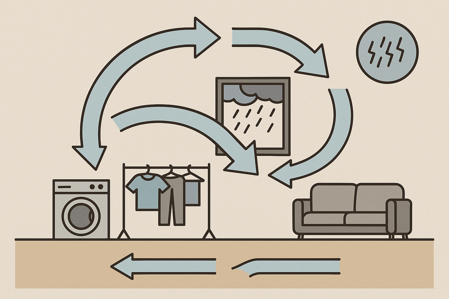 장마철 실내 습도 구조 흐름 이미지 장마철의 습도 구조를 이해하면 실내 빨래 문제 해결에 더 가까워집니다.
