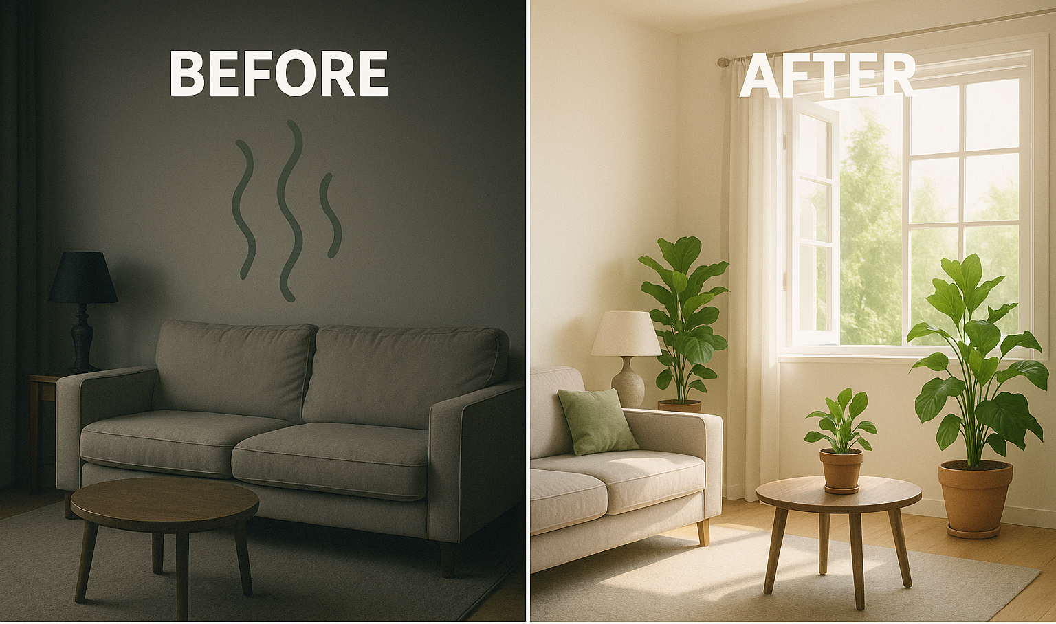 왼쪽 :  퀴퀴한 거실  /  오른쪽 :  식물과 환기된 밝은 거실  –  이렇게 달라질 수 있어요 !
