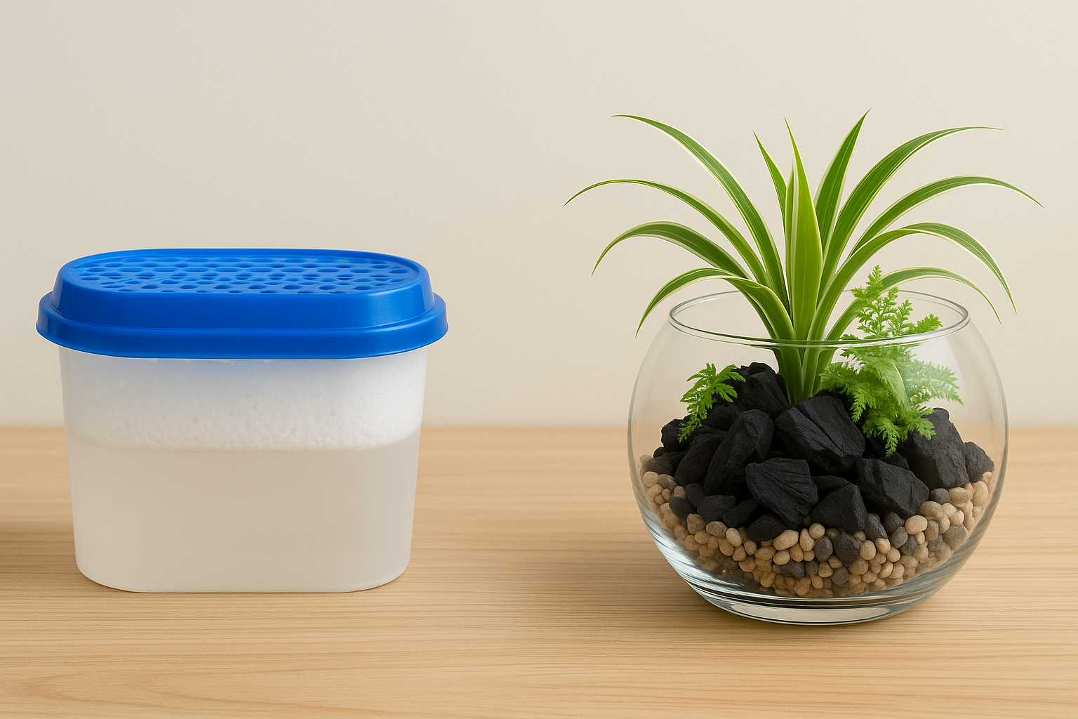 왼쪽 : 기존 플라스틱 제습제 / 오른쪽 : 테라리움 + 숯 조합 인테리어 집 분위기를 해치지 않고 냄새를 줄이는 방법, 의외로 가까이에 있어요!
