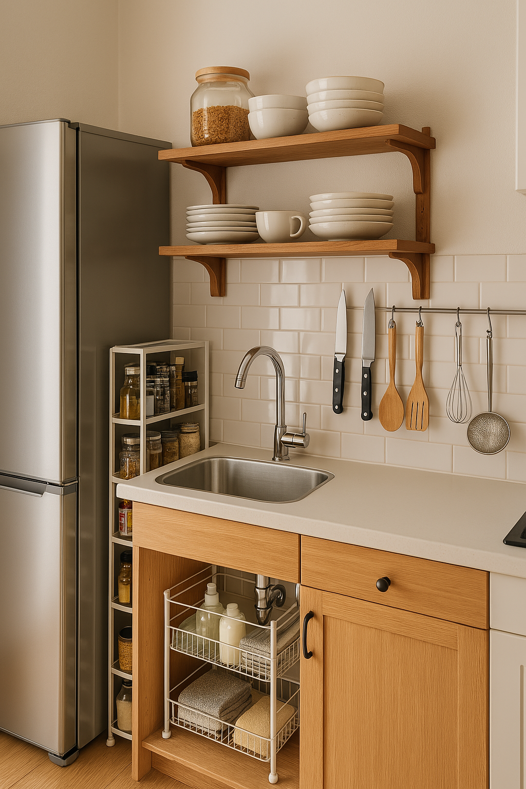"보이는 수납 + 틈새 수납 + 이중 수납"이 모두 반영된 좁은 주방 수납의 정석 이미지!